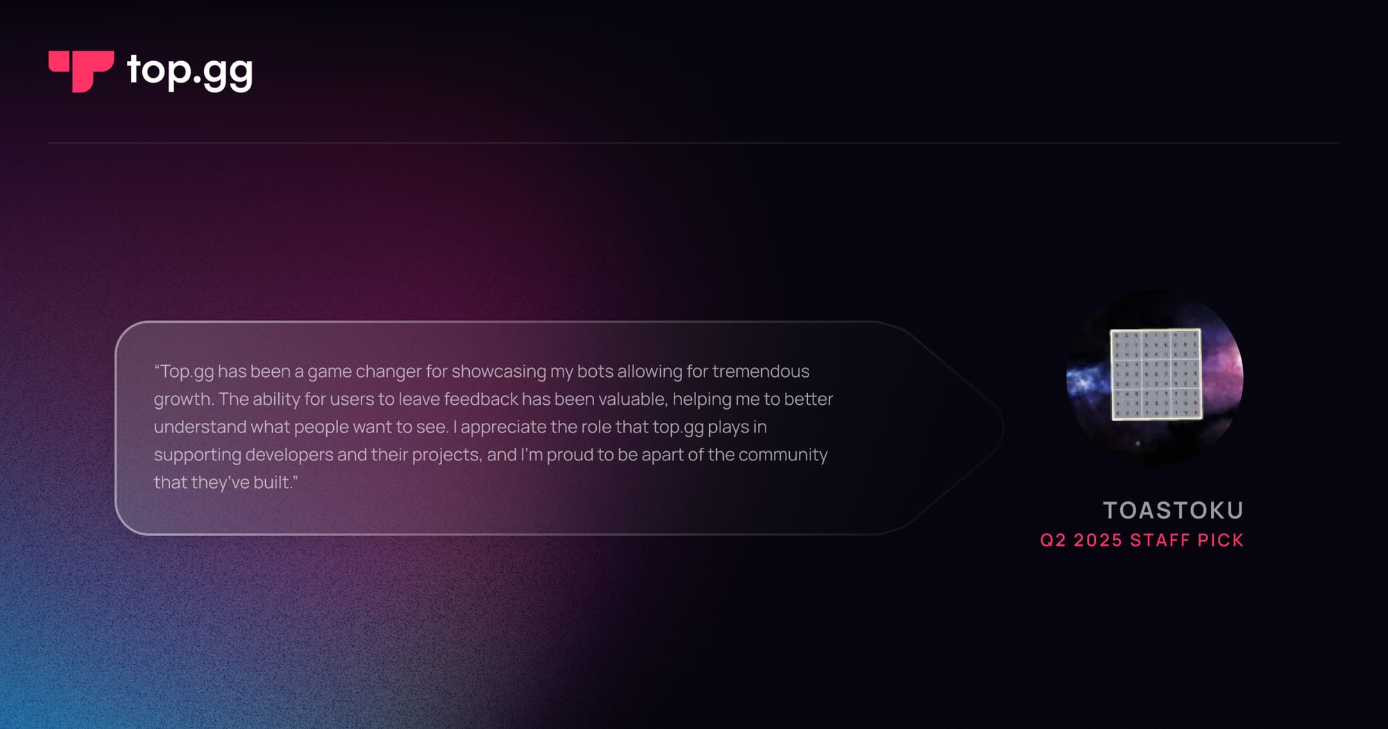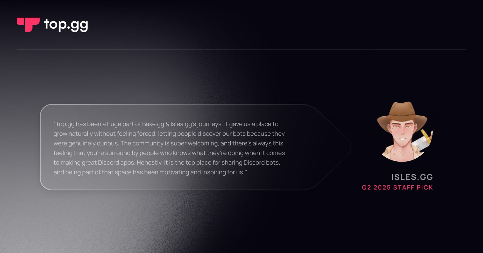 Staff Picks are Top.gg’s way of celebrating bots that wow us each quarter. From clever tools to fun experiences, these highlights spotlight the unique and creative bots you’ll want to add to your server.