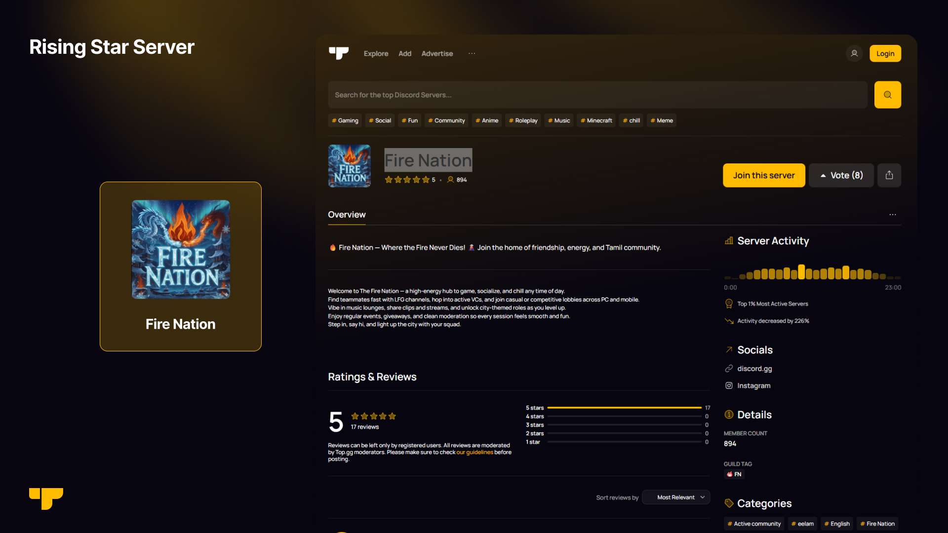 "Fire Nation is a Tamil-rooted Discord community that is open and welcoming to everyone, focused on chilling, gaming, and socializing in a positive and inclusive space. We prioritize kindness, safety, and genuine connection over toxicity or forced engagement."