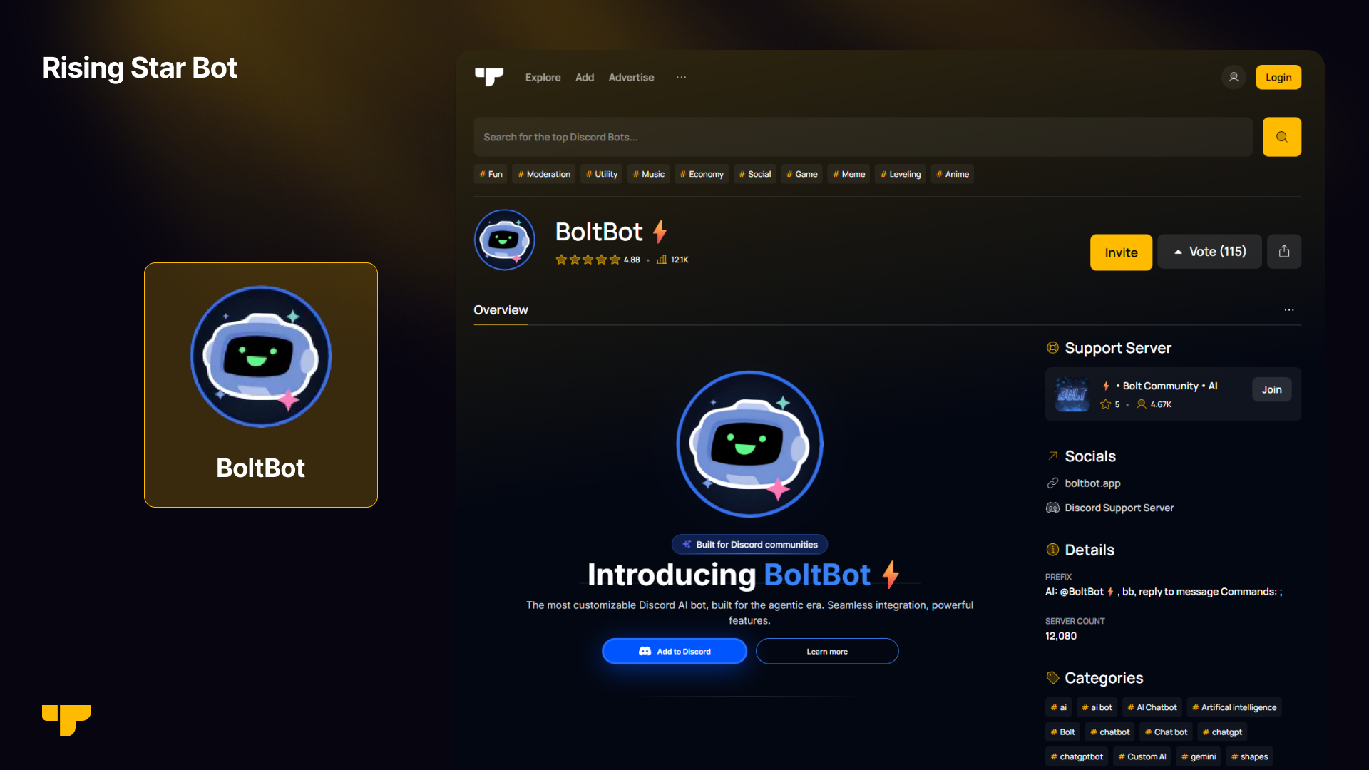 "BoltBot⚡️is an AI-powered discord chatbot combining multiple AI models, deep customization, rich integrations, and powerful AI tools all in one seamless dashboard."