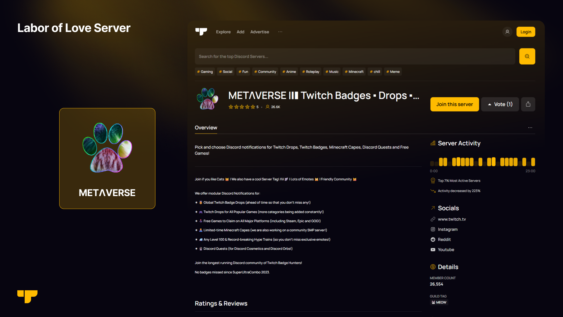 "METΛVERSE is a cozy, beautifully curated community where Gamers, Cats, and Content Creators come together in pure purr-fection. Founded in early 2023, this Labor of Love has grown to over 20,000 members who delight in sharing silly, adorable felines and receiving real-time notifications for Twitch Badges, Drops, Free-to-claim Titles, and Discord Quests—all thoughtfully delivered through our choice-based system with you in mind. Join our vibrant, one-of-a-kind Cat Café on Discord today!"