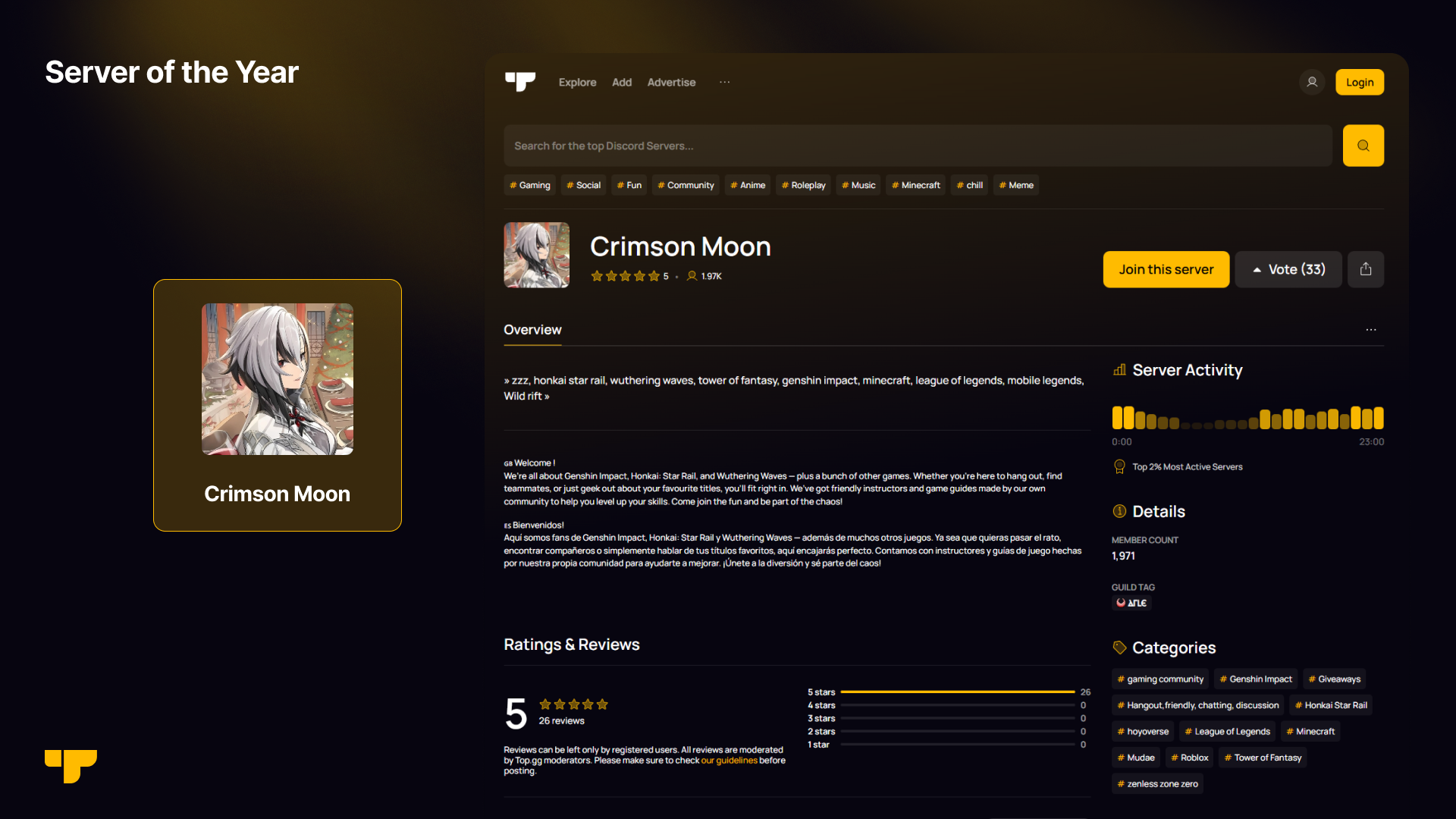 "Our server is a bilingual Spanish/English community focused on gacha games, especially Genshin Impact. It’s a place where people can chat, have a great time, and take part in giveaways and events with prizes like Robux, Nitro, and monthly gacha subscriptions. We want to highlight that we’re a social, Genshin Impact–based community that proudly supports both English and Spanish speakers."